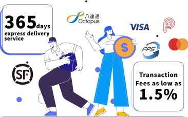 Fees as low as 1.5% via common local payment methods such as PayMe, FPS, WeChat Pay HK and AlipayHK. Connection to SF Express, etc. facilitates efficient shipping.